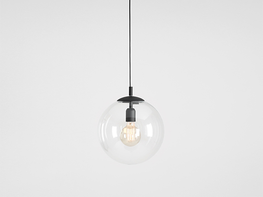 Simple in form, a pendant lamp with a transparent shade with a diameter of 30cm, powder-coated in matte black.