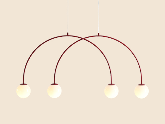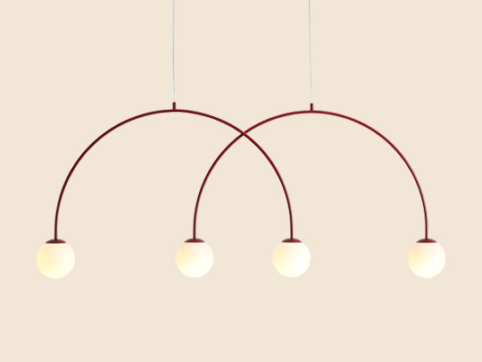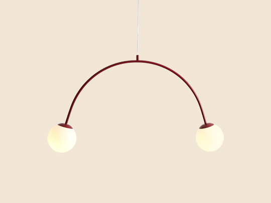Lampa wisząca w kształcie łuku w bordowym kolorze, z dwoma kloszami 14cm.