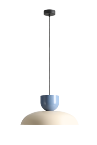 Lampa wisząca Ella Cream + Dusty Blue to wyraziste połączenie miękkiej formy i subtelnego kontrastu barw. Kremowy, szeroki klosz o średnicy 47 cm tworzy spokojną bazę dla całej kompozycji, natomiast mniejszy element w odcieniu przygaszonego błękitu wprowadza świeży, nowoczesny akcent. Czarny przewód podkreśla całość graficzną linią, dodając lampie eleganckiego charakteru. Zestawienie dwóch form o różnych proporcjach sprawia, że model Ella przyciąga uwagę, pozostając jednocześnie harmonijnym elementem aranżacji. Lampa doskonale sprawdzi się nad stołem w jadalni, w salonie lub w kuchni, gdzie poza funkcją oświetlenia pełni także rolę stylowej dekoracji wnętrza.